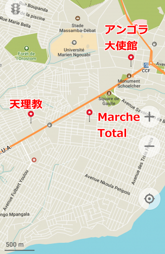 行き方:ブラザヴィルから「ODYSEE」社のバスで来る場合、終点の「Arret fond Tie Tie(アーフォン・チェチェ)」で下車。そこから天理教方面に行くミニバス(100CFA)に乗車(どのバスでも通る)。