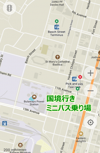 ・もう1つの緑ピンは市場近くの大きなバスターミナルで、そこからも国境行きミニバスが出ている。ハラレ直通バスもあると思う。