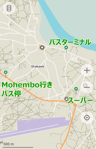 ※コンビス(ミニバス)で行く場合はMohemboのフェリー乗り場まで行くので途中下車し、そこから徒歩かヒッチハイクで国境まで。コンビスはP3.5。