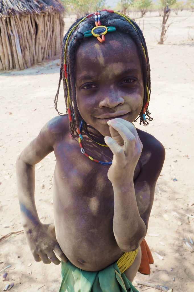 デンバ族の女性は写真のように前髪を黒い液体を固めているのが特徴。この黒い液体は木を燃やした後の炭を水で溶いてつくっているとのこと。